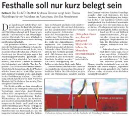 Herr Oberbürgermeister Palm ging in seiner Antwort davon aus, dass die Festhalle Schmiden entsprechend den Informationen des Landratsamts nur kurz genutzt wird und später noch einmal wörtlich: "Wir gehen aber davon aus, dass wir genügend Möglichkeiten haben, die Menschen unterzubringen, außerhalb von Hallen."