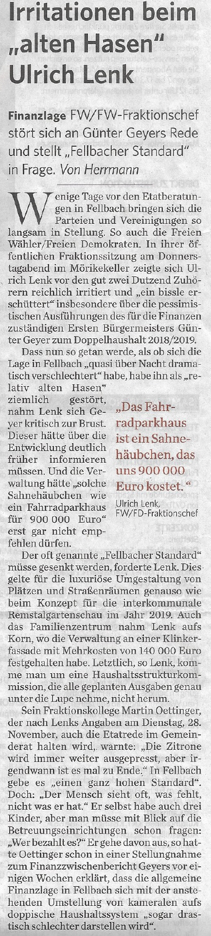 Irritationen beim "alten Hasen" Ulrich Lenk, Fellbacher Zeitung vom 18.11.2017, Bild anklicken zum Lesen.